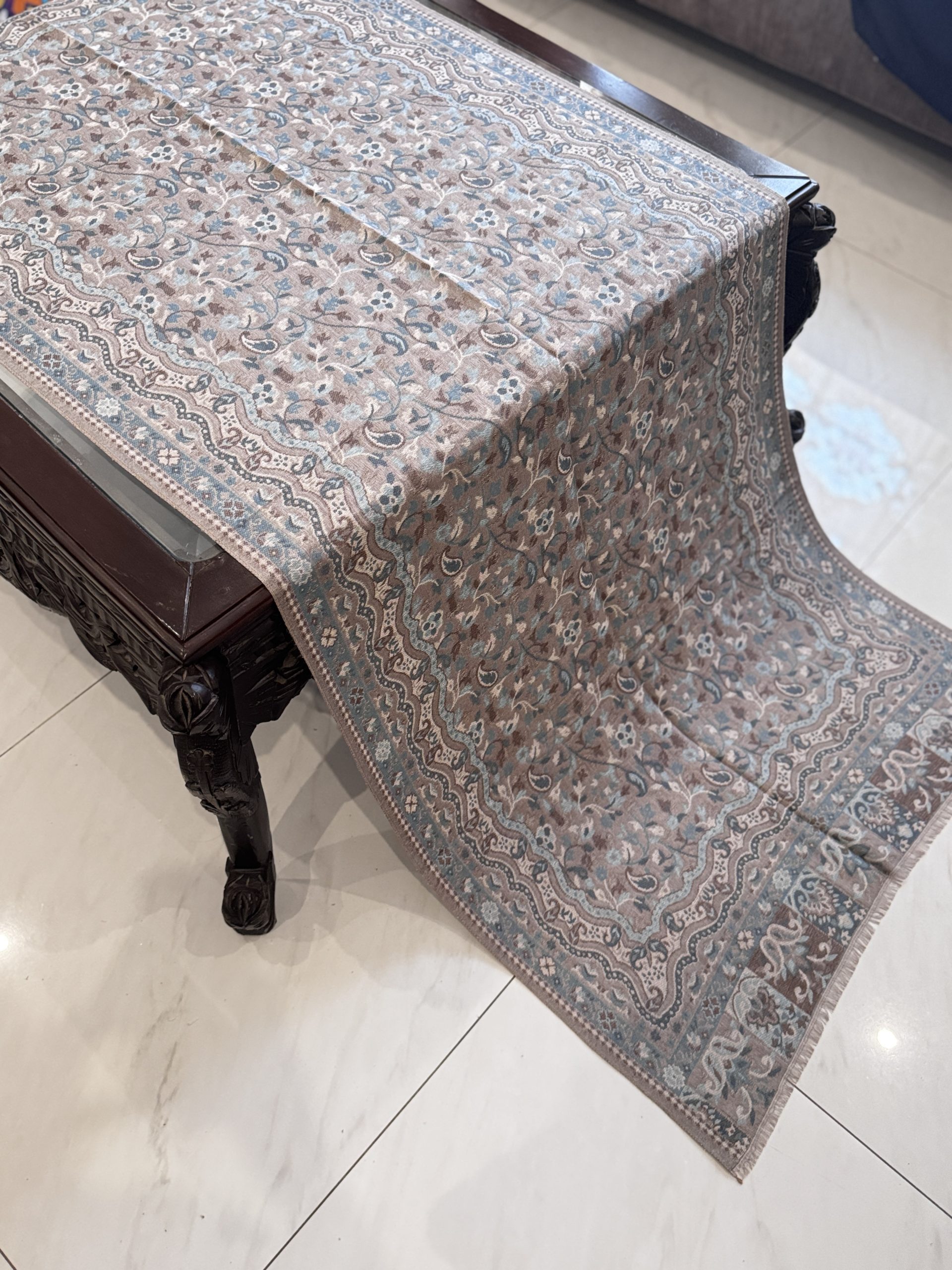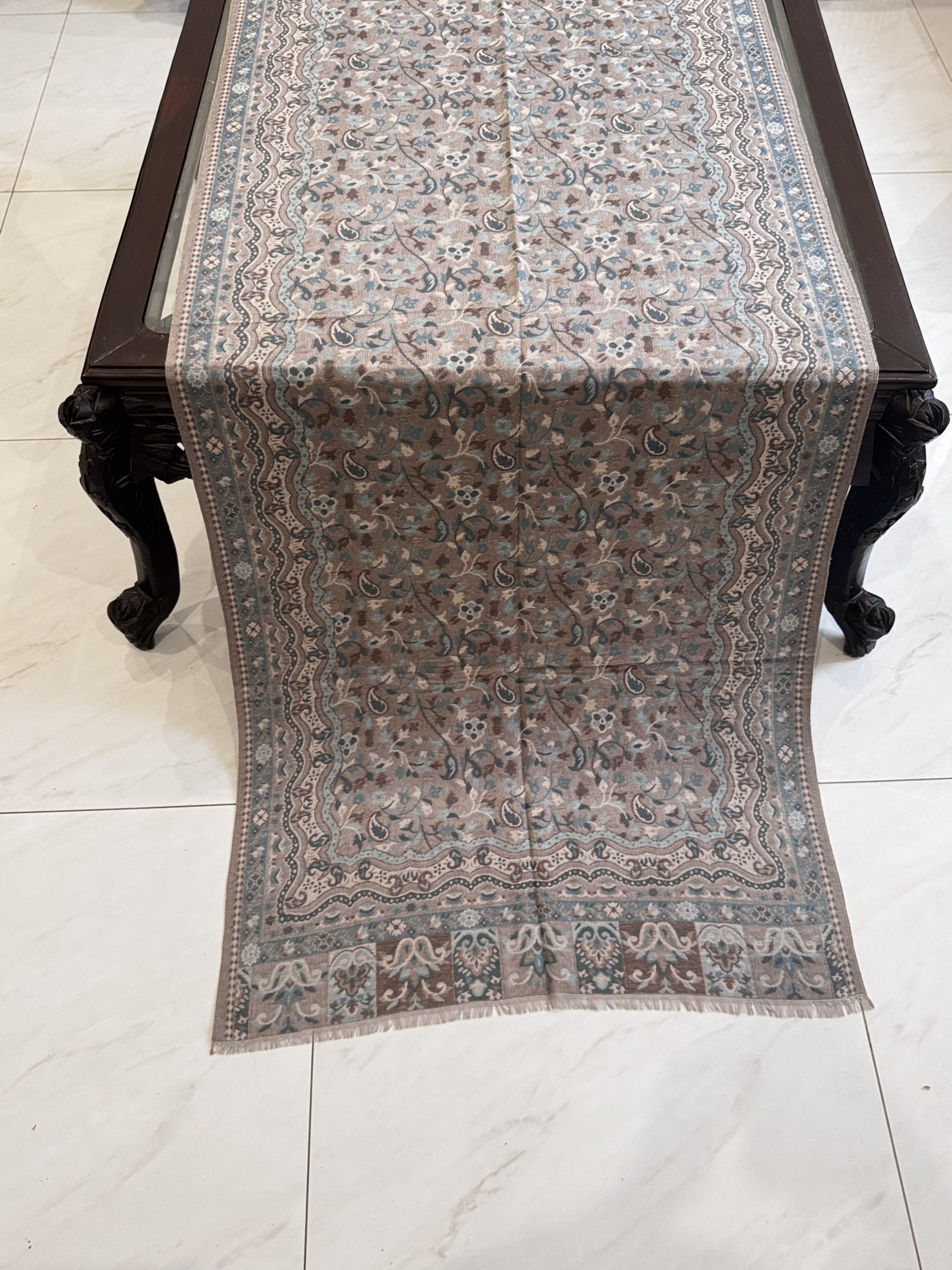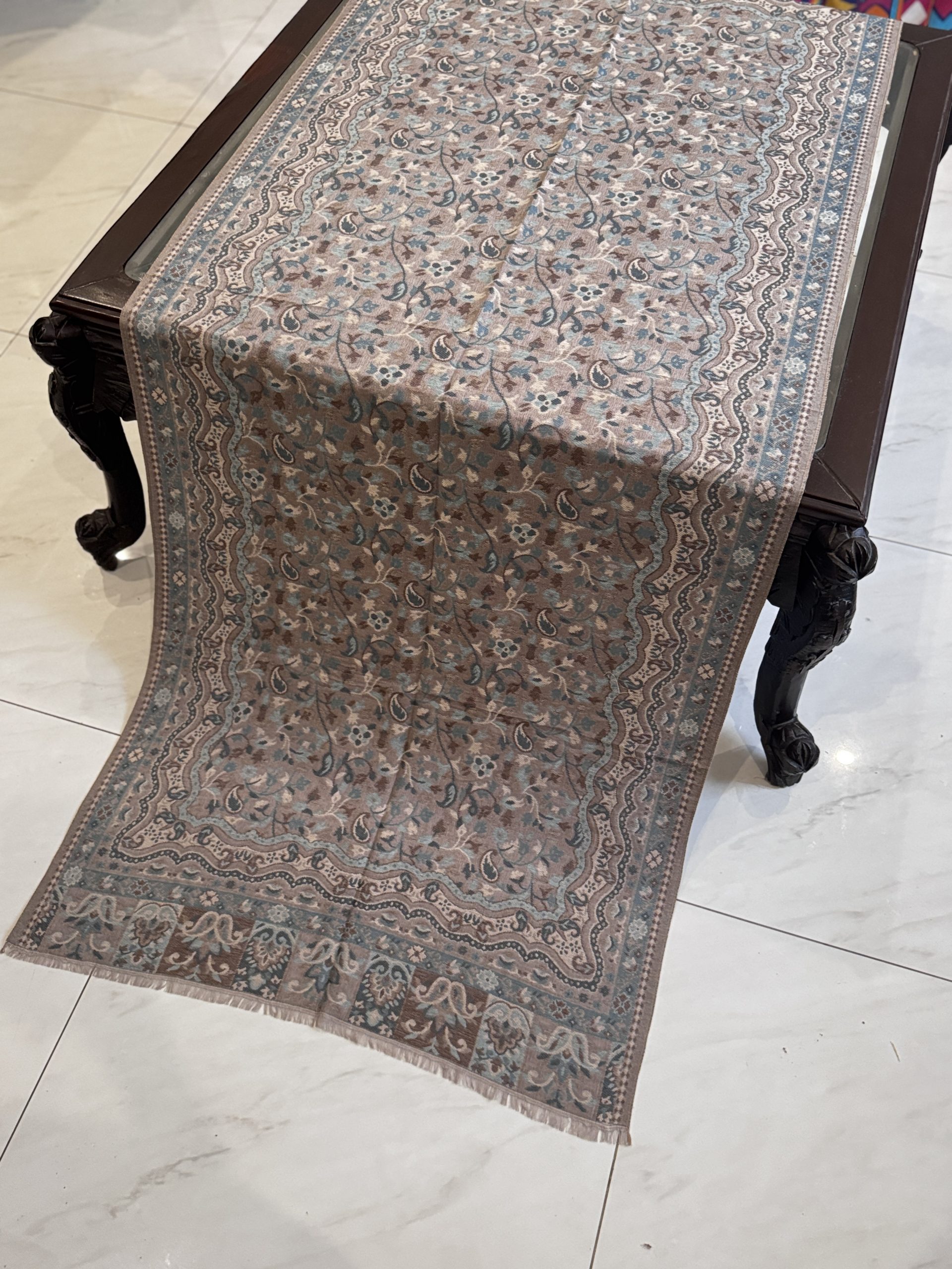 The Bahaar Kani Cashmere Stole radiates timeless artistry with its full artistic design, intricately woven across a warm dark beige base. The muted tone highlights the detailing of the Mughal-inspired motifs, making it a versatile piece that balances subtlety with sophistication. Handwoven in authentic Kani technique, it offers natural softness, gentle warmth, and artisanal charm, complete with carefully finished edges.