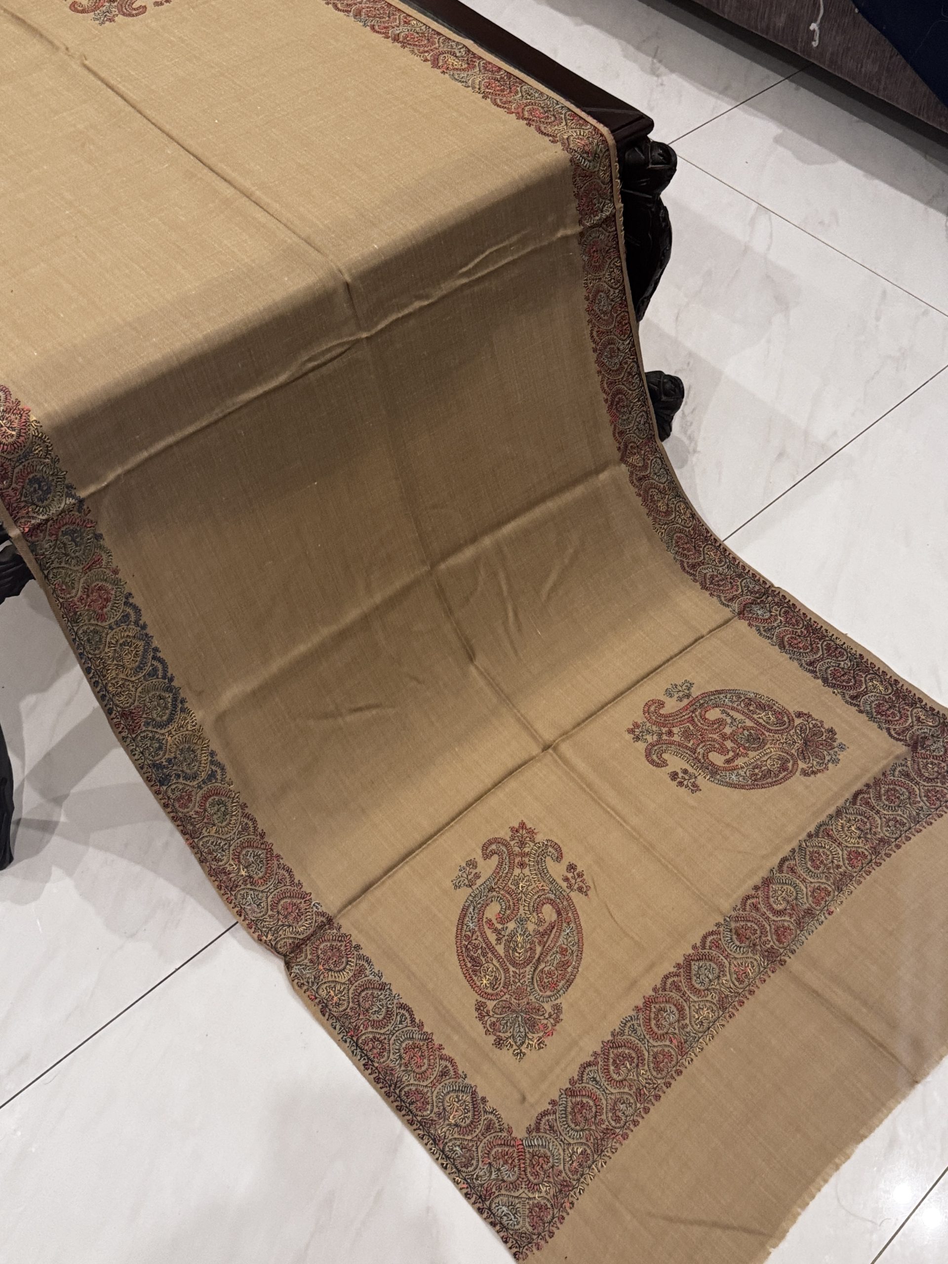 Inara – Warm Beige Pashmina Stole with Classic Border Embroidery (28×80 inches)