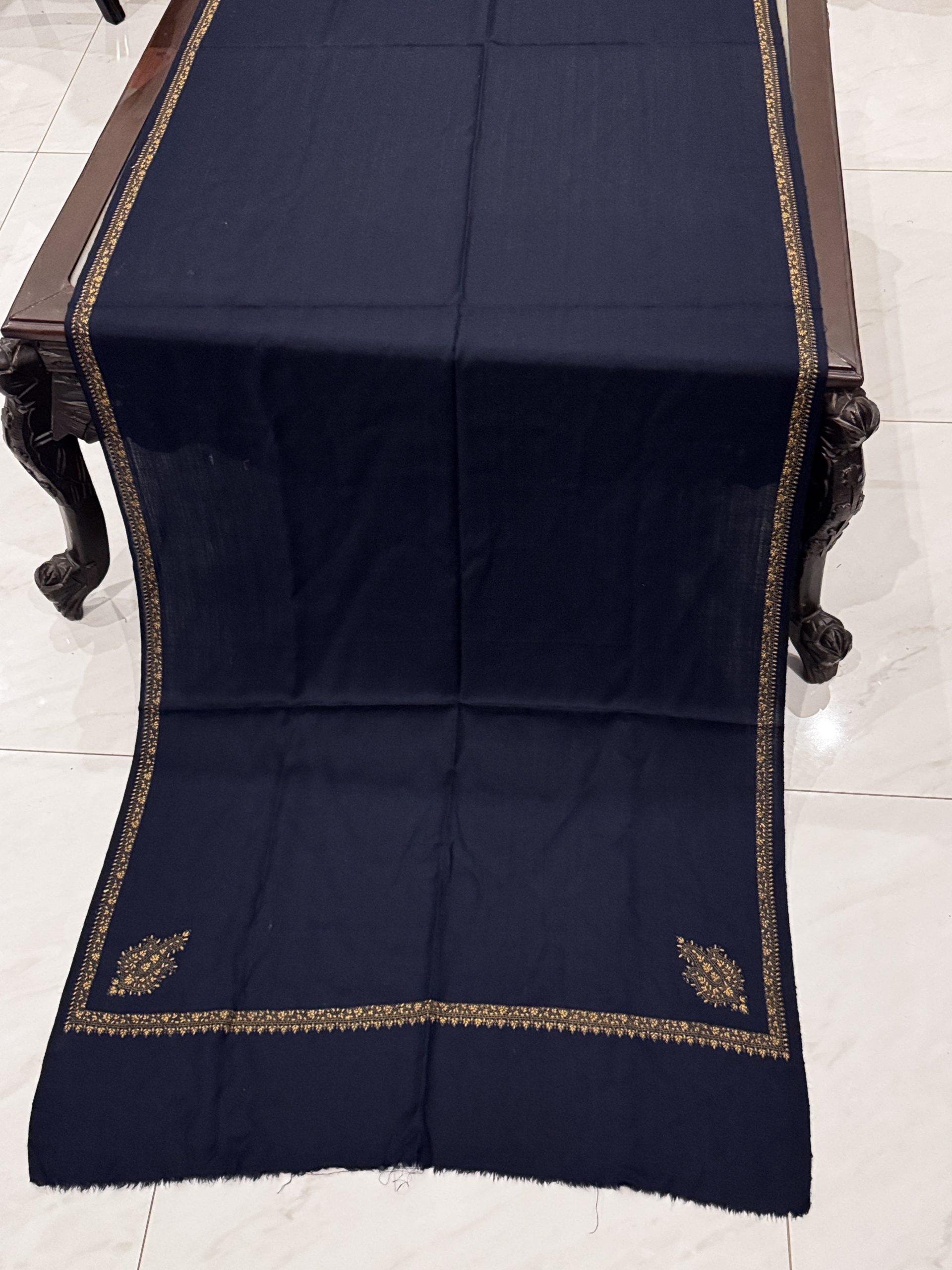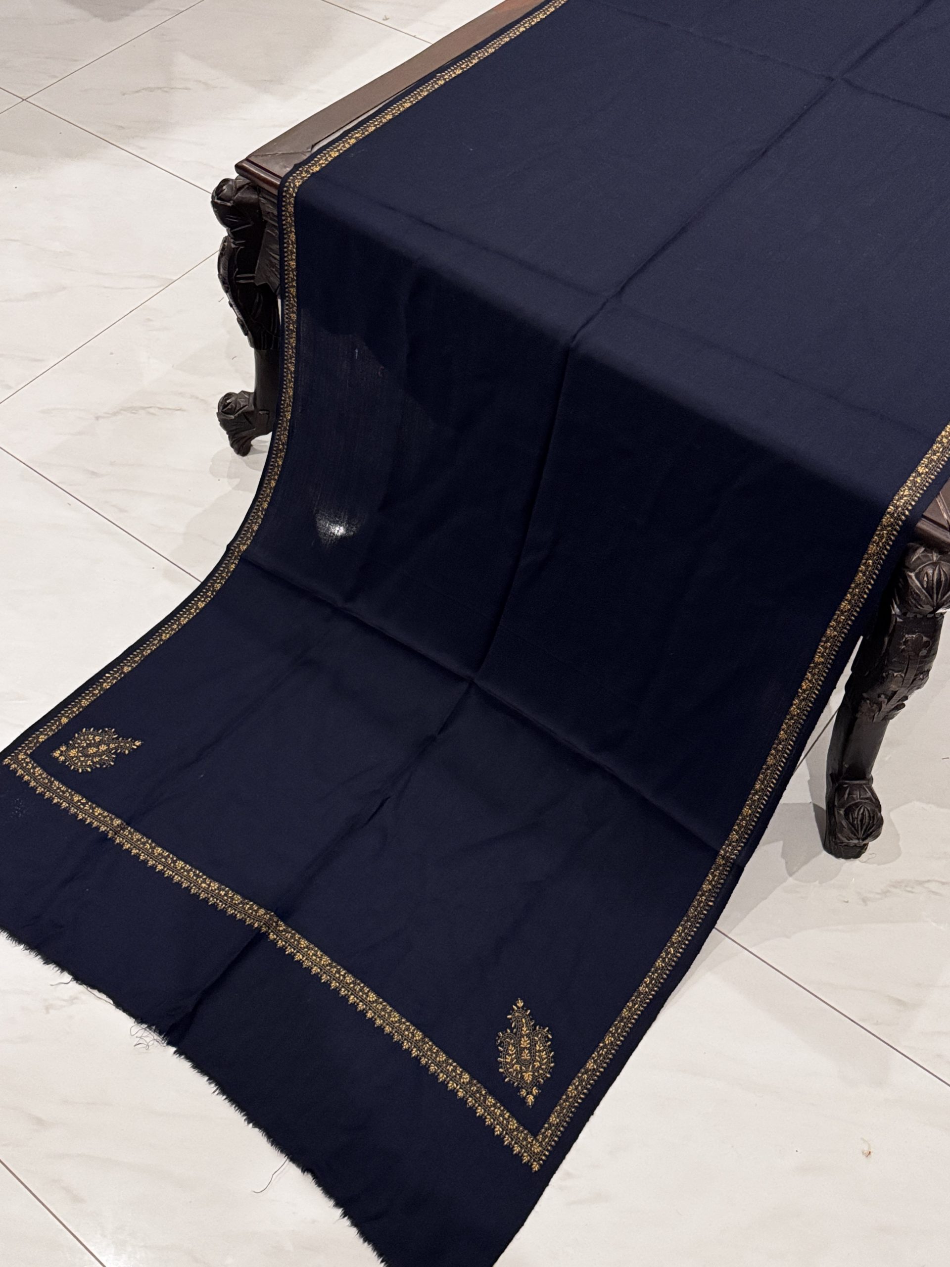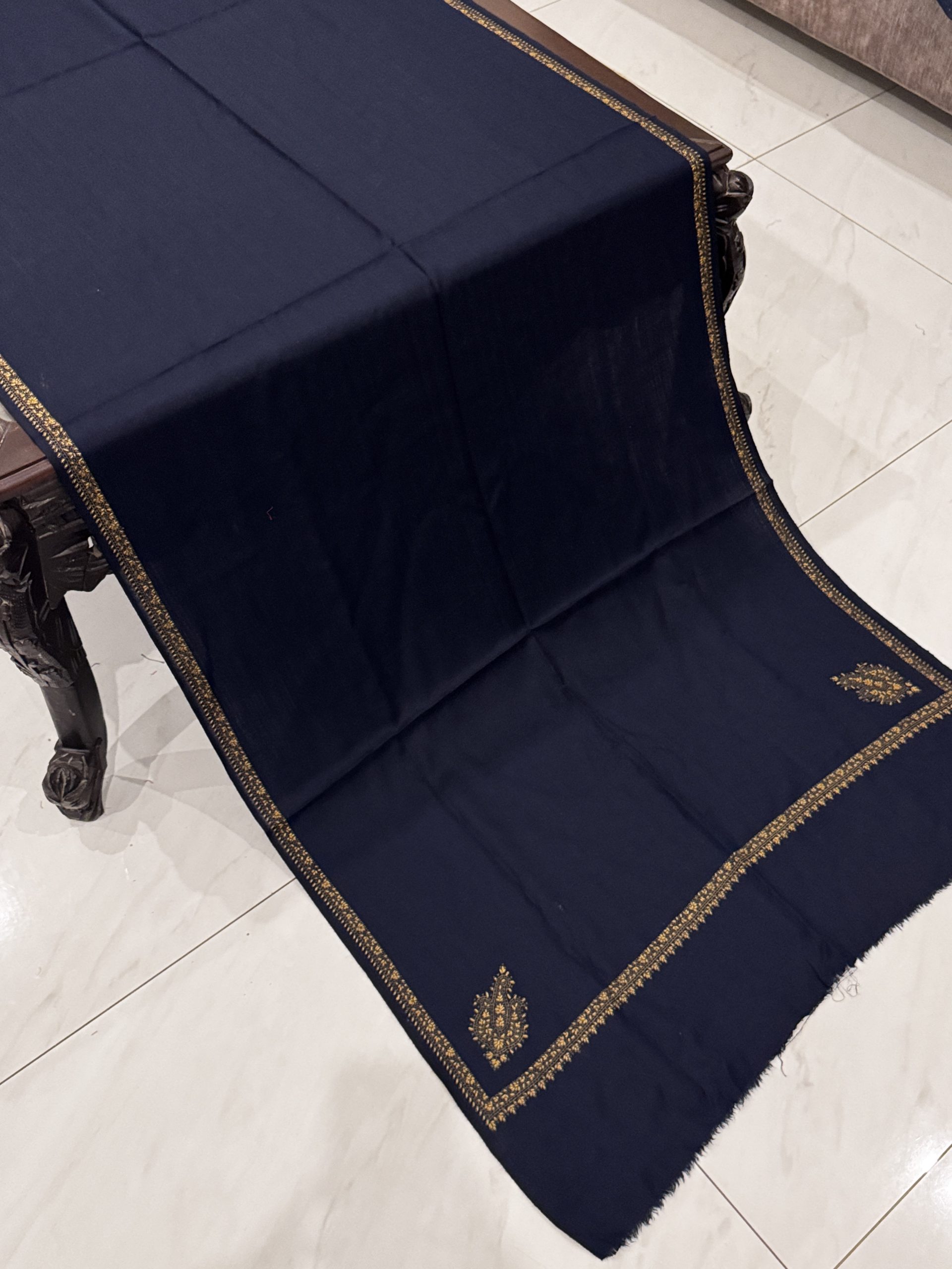 The Mahveen Stole pairs the rich depth of a navy blue Pashmina base with the refined artistry of Kingri-style embroidered borders. The bold, classic color adds a regal charm to winter outfits, while rough-cut edges bring a handcrafted, artisanal touch. Perfect for both special occasions and everyday elegance.