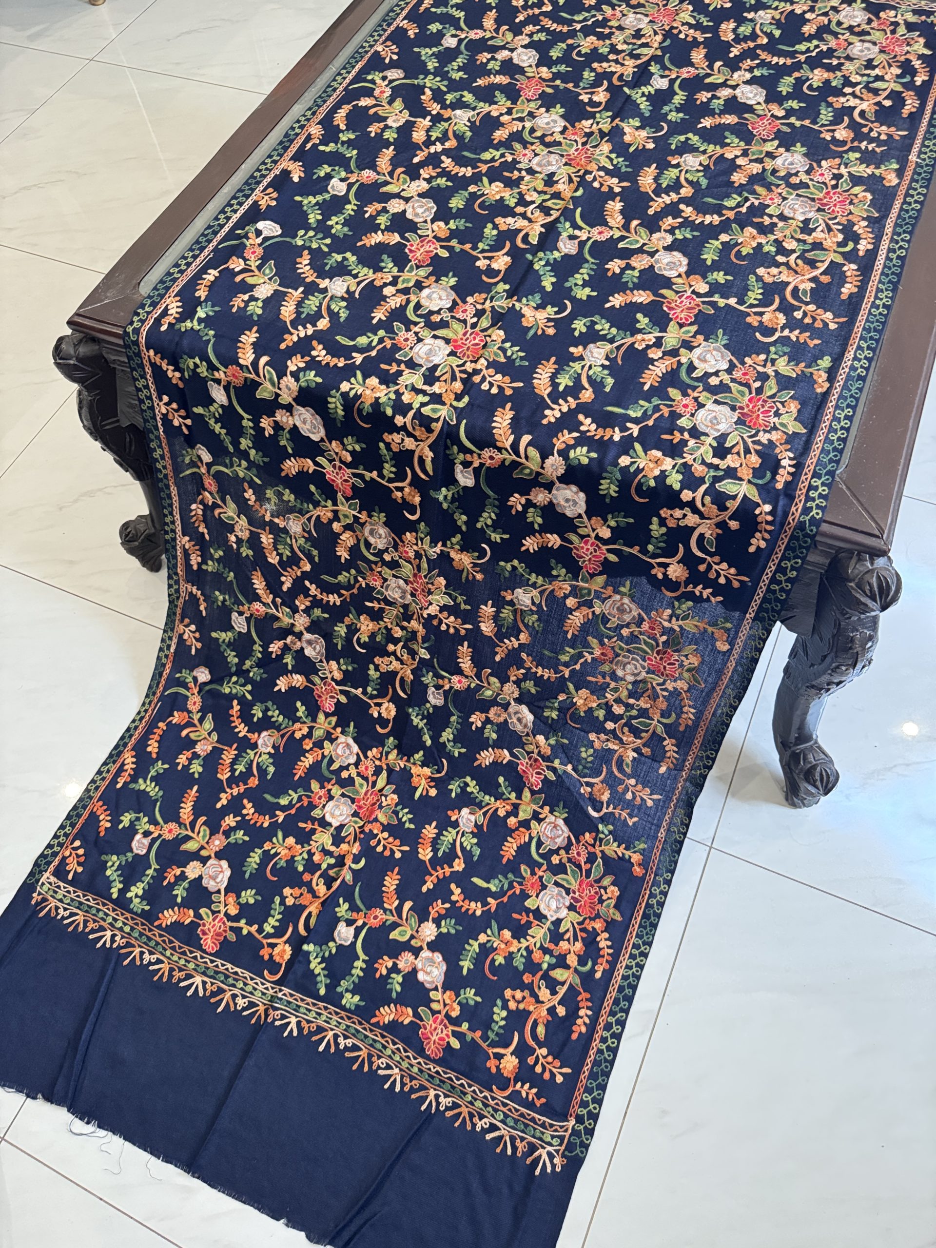 Navy Blue Pashmina Stole with Floral Aari Embroidery (28×80 inches)
