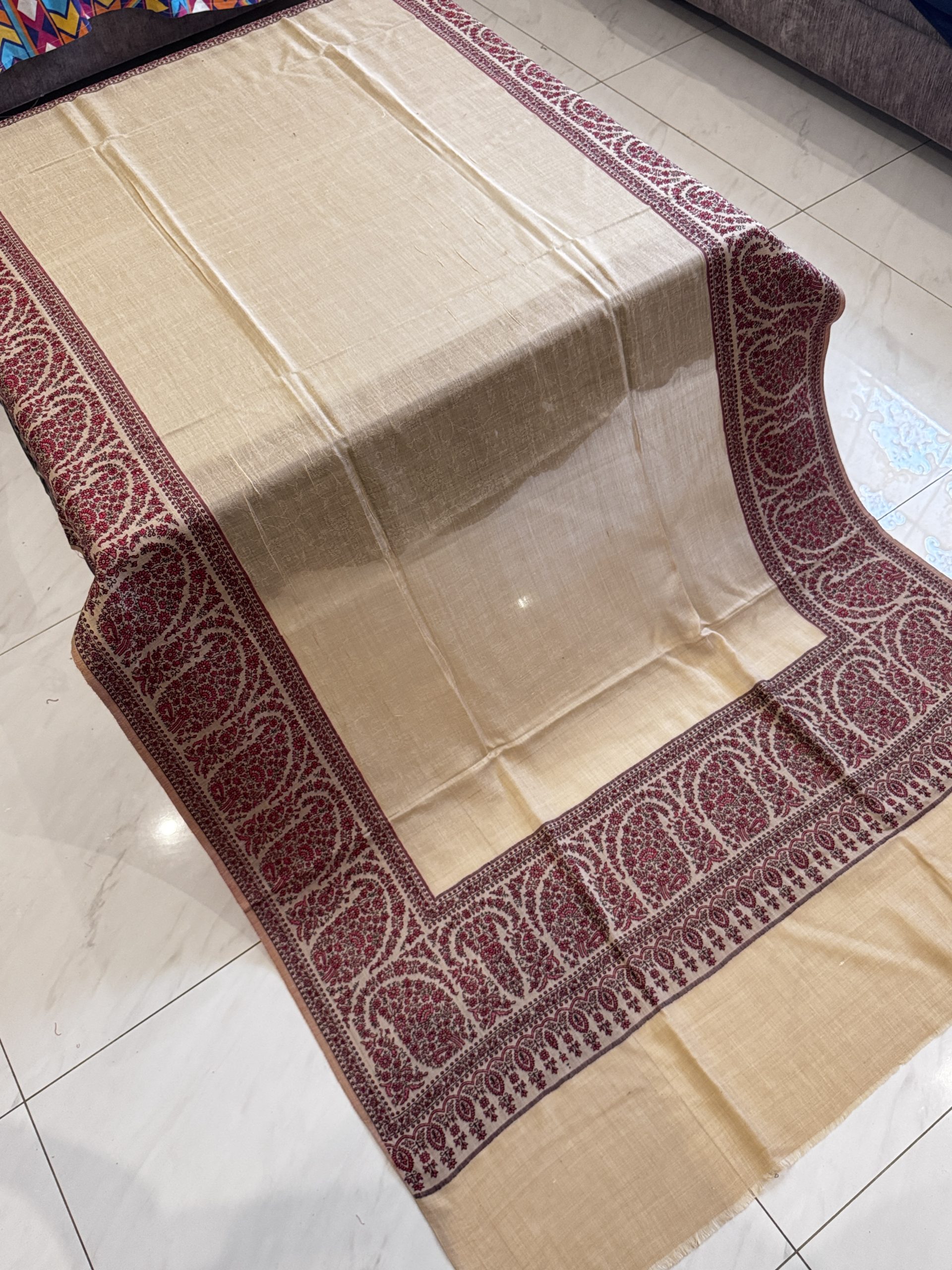 The Shahkaar-e-Khas Shawl brings together the luxurious texture of Jamawar Pashmina with the grandeur of a wide Kani woven border. The soft beige base offers a versatile, refined backdrop, while the richly detailed border adds a statement of heritage elegance. Warm, lightweight, and generously sized, it’s a perfect blend of comfort and tradition.