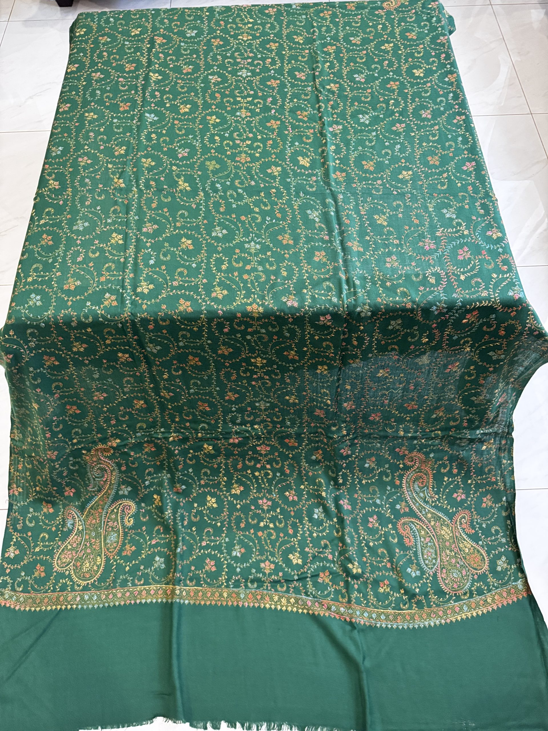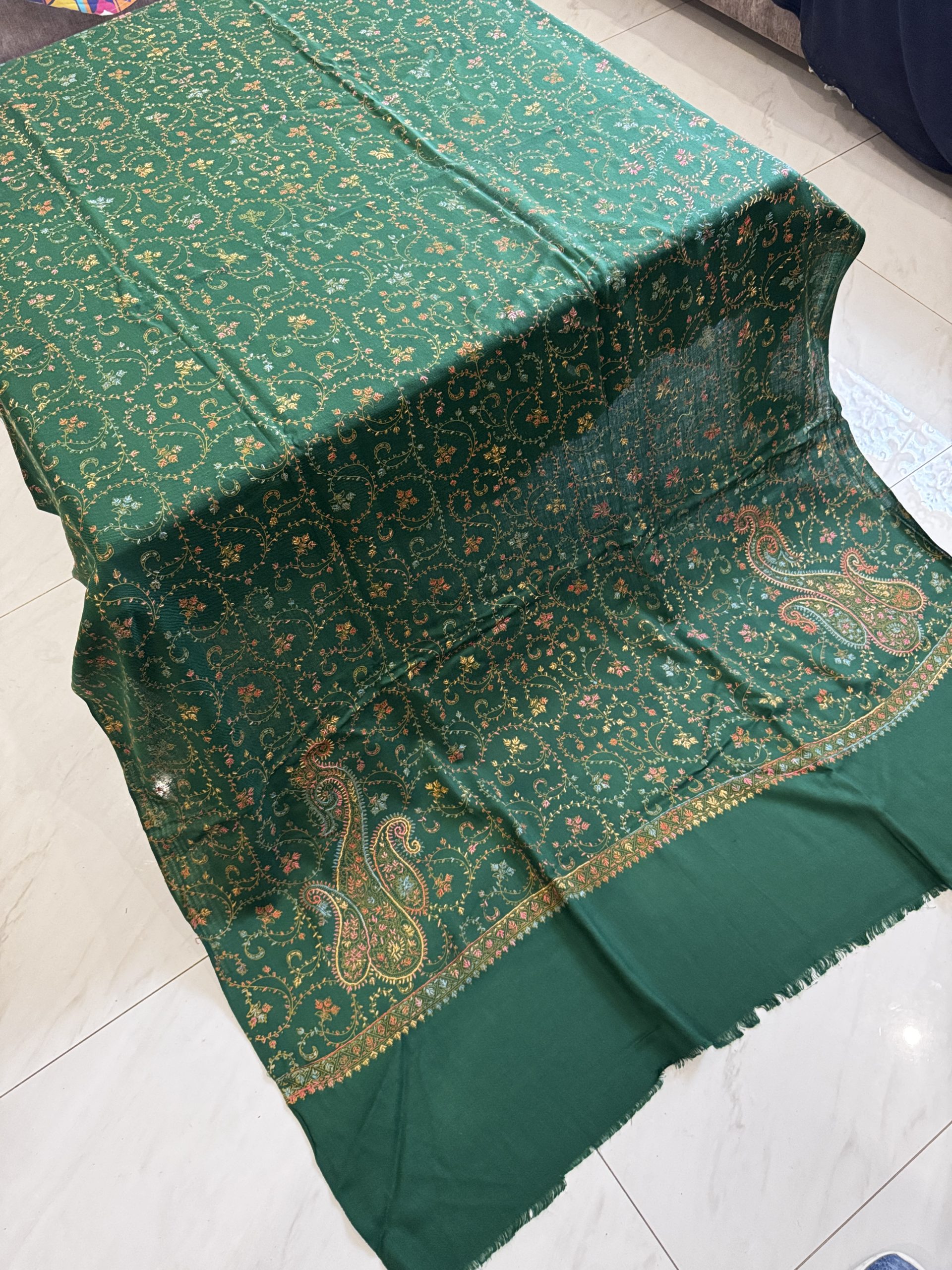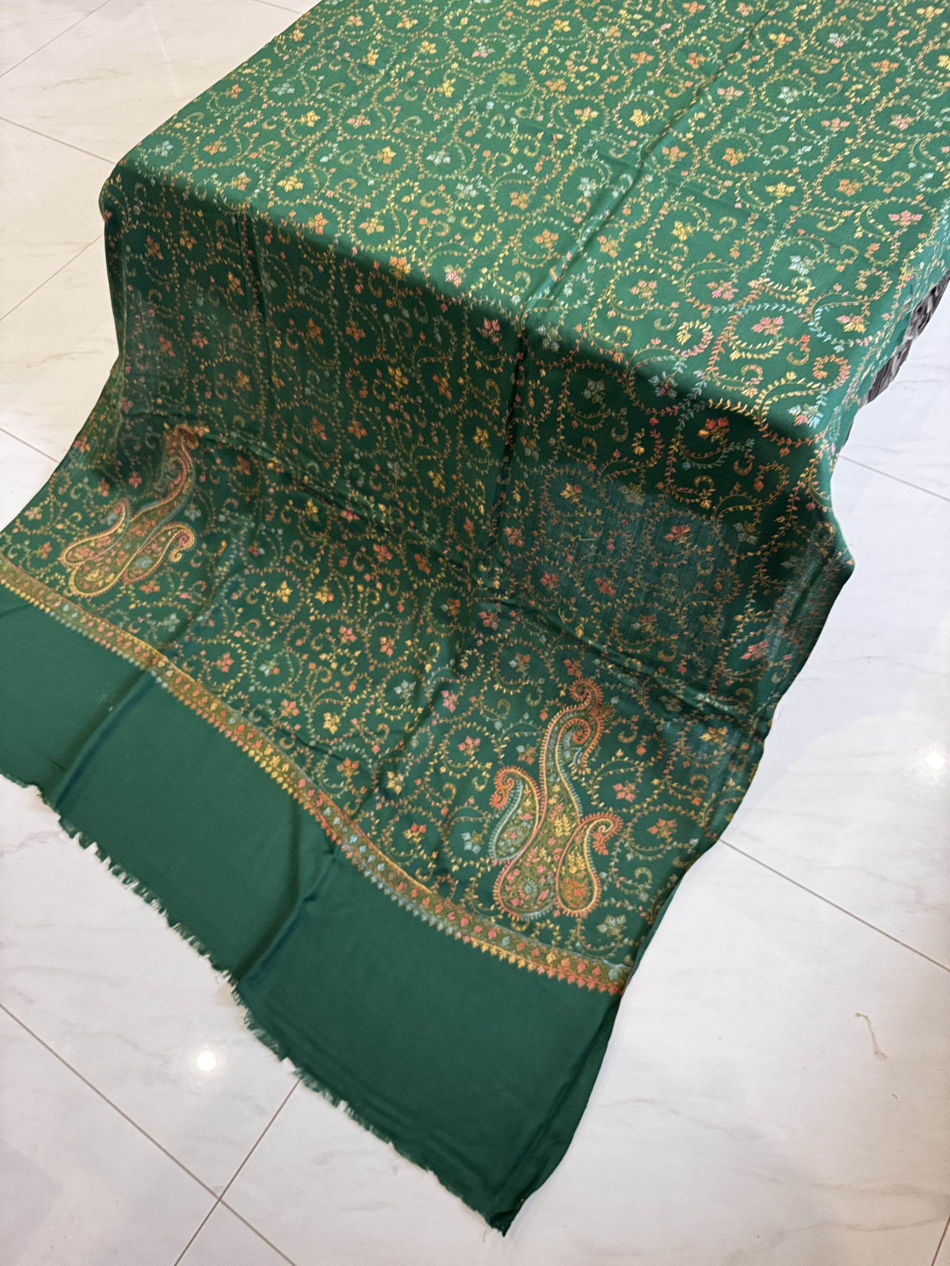 Verdant Grace – Fully Embroidered Pashmina Shawl in Bottle Green (2.5 Yards)
